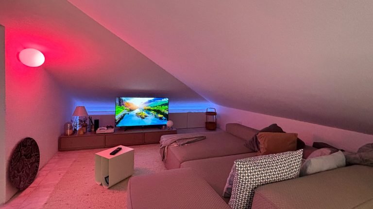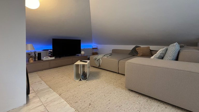 Al secondo piano è stato realizzato un soggiorno, con divano e angolo tv sotto la mansarde per creare uno spazio cinema sotto tetto. In questo ambiente le luci possono essere cambiate di colore per creare la giusta atmosfera.