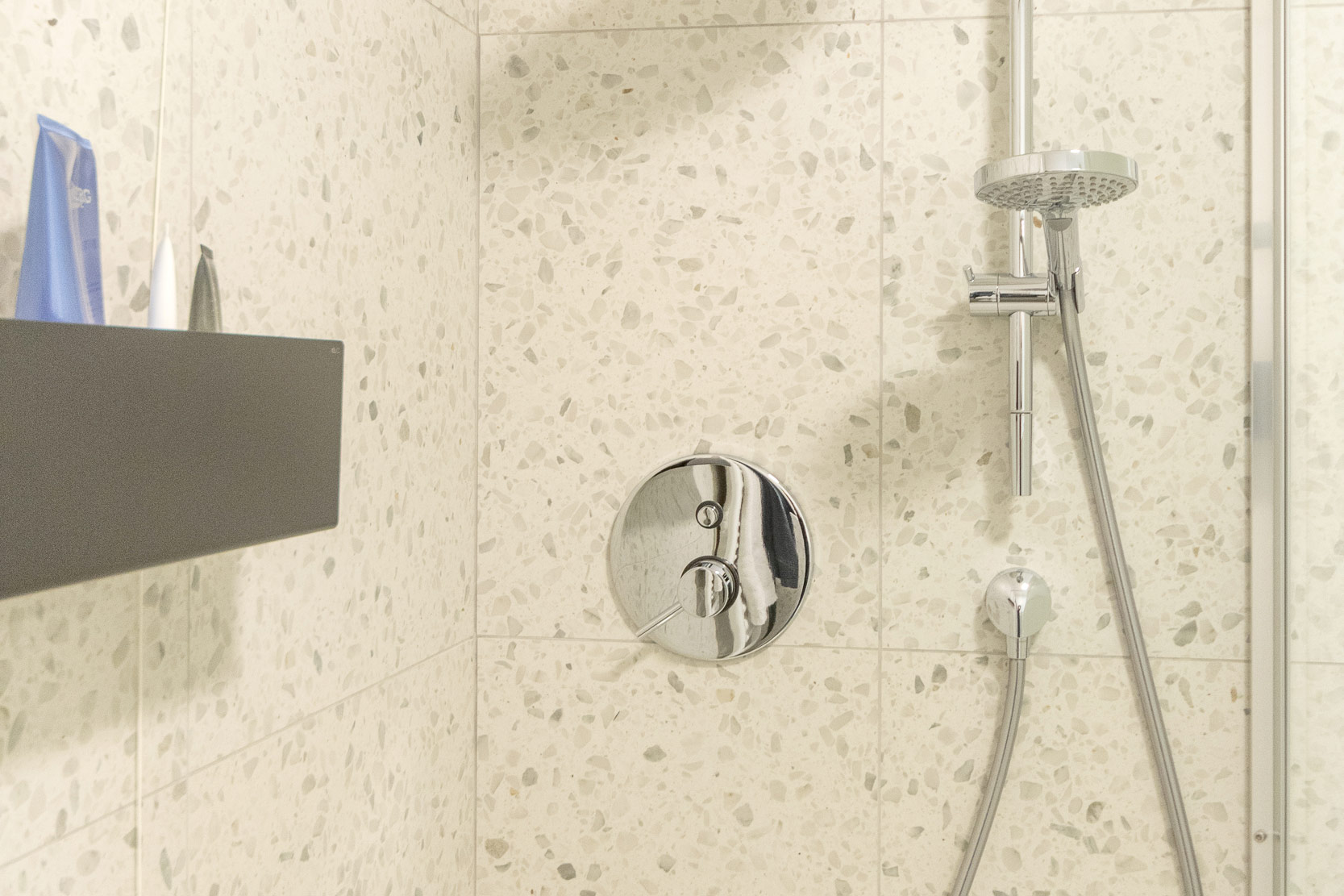 Il nuovo bagno è completo di wc, bidet, lavabo, zona lavatrice e doccia walk in, realizzato interamente con piastrelle in stile terrazzo veneziano della Florim.