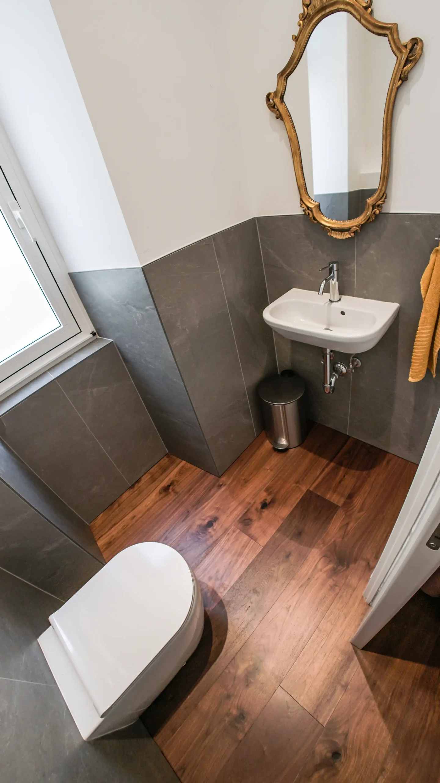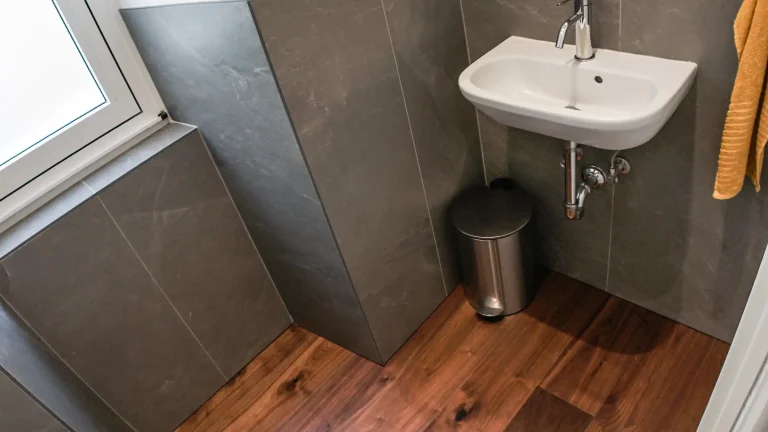 Il secondo bagno ha piastrelle Panaria della collezione Stone trace crest (60×120 6 mm) di color grigio mentre il pavimento è in essenza legno noce, compreso l’antibagno.